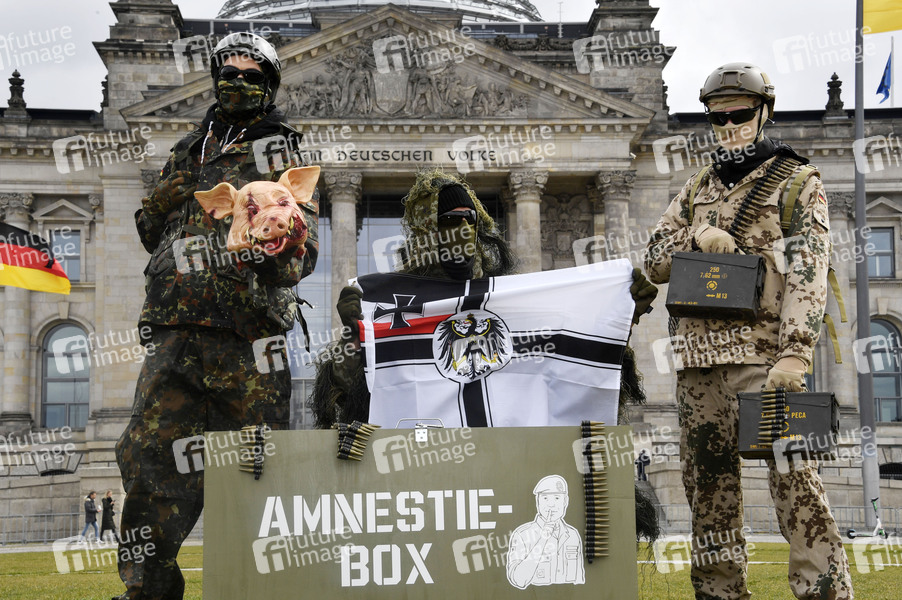 Protestaktion zur Sondersitzung des Verteidigungsausschusses des Bundestags zu den Vorfällen bei den Kommando Spezialkräften (KSK) der Bundeswehr vor dem Reichstagsgebäude. Bei der Aktion führen drei als KSK-Soldaten in voller Tarnmontur gekleidete Aktivisten vor der Kulisse des Bundestagsgebäudes die letzten Skandale der Bundeswehr-Einheit vor: Einer hält einen (künstlichen) blutverschmierten Schweinekopf in Händen, ein anderer zeigt rechtsextreme Symbolik und der dritte trägt Munitionskisten und Munition. Damit sollen die skandalträchtigen 'Partys' einiger KSK-Soldaten (bei denen reale Schweineköpfe verwendet wurden), die rechtsextremen Vorfälle in der Einheit sowie den Munitionsklau symbolisiert werden. Weiterhin wird ein Transparent mit der Aufschrift 'Kommando Spezialkräfte Auflösen' mit dem durchgestrichenen Wappen der Einheit gezeigt. Berlin, 12.04.2021