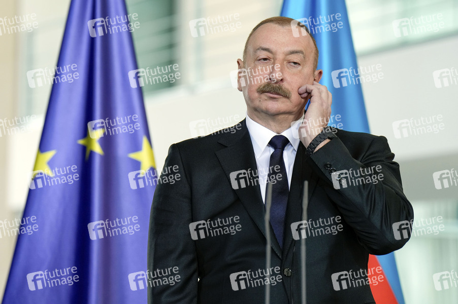 Ilham Alijew beim Empfang des Präsidenten von Aserbaidschan zu einem Gespräch mit dem Bundeskanzler mit anschließendem Pressestatement im Bundeskanzleramt. Berlin, 26.04.2024