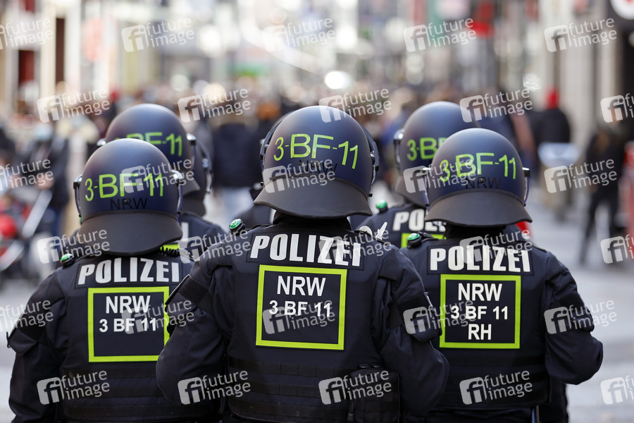 Am Rande einer unangemeldete Demo von Kritikern der Corona-Maßnahmen vor dem Kölner Dom führten Polizei und Ordnungsamt zahlreiche Kontrollen auf Einhaltung der Corona-Maßnahmen wie Mindestabstand und Maskenpflicht durch. Ab Montag will NRW wegen der steigenden Inzidenzzahlen noch strengere Corona-Regeln anwenden. Im Bild eine Einheit der Polizei, die eine Gruppe Corona-Demonstranten ohne Masken durch die Innenstadt verfolgt. Köln, 27.03.2021