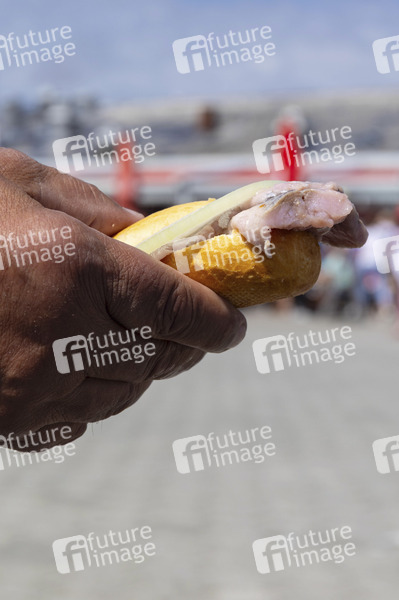 Matjesbrötchen, Heringsbrötchen, Fischbrötchen, Imbiss, Brötchen, Zwiebeln, Fischbude, gesunde Delikatresse, Fettgehalt, Symbolbild, Themenbild