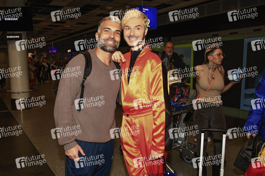 Rafi Rachek und Sam Dylan bei der Rückkehr der Dschungelcamp-Kandidaten der RTL Reality-TV-Show 'Ich bin ein Star - holt mich hier raus' aus Australien auf dem Flughafen Frankfurt am Main. Frankfurt, 12.02.2025