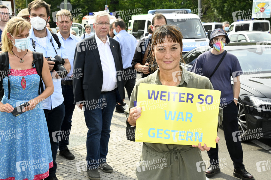 Lu Yen Roloff, freie Kandidatin für den Bundestag 2021, bei einer Gedenkveranstaltung zum 60. Jahrestag des Baus der Berliner Mauer mit Armin Laschet an der Glienicker Brücke. Potsdam, 13.08.2021