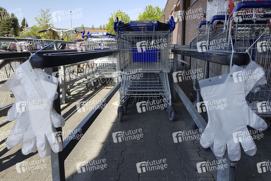 Schutzhandschuhe für Einkaufswagen - Coronaschutzmaßnahmen beim Einkaufen im Einkaufzentrum. Springe, 24.04.220