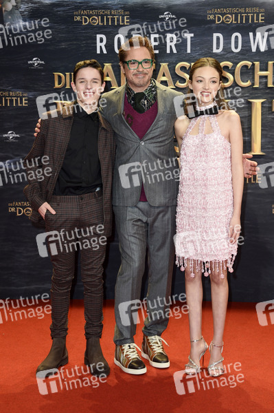 Harry Collet, Robert Downey Jr. und Carmel Laniado bei der Premiere des Kinofilms 'Die fantastische Reise des Dr. Dolittle' im Zoo Palast. Berlin, 19.01.2020