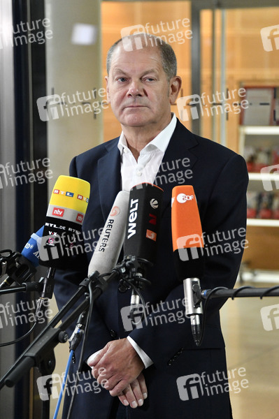 Olaf Scholz beim Pressestatement zu den Ereignissen im Rahmen der Großdemonstration in Berlin gegen die bestehenden Maßnahmen zur Eindämmung der Corona-Pandemie in der Passage vor dem Willy-Brandt-Haus. Berlin, 30.08.2020