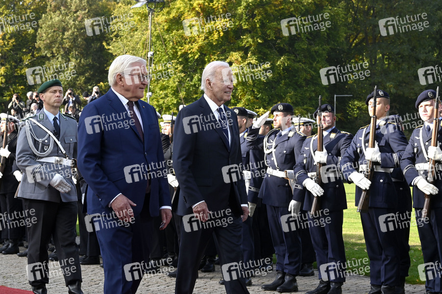 Frank-Walter Steinmeier und Joe Biden beim Empfang des amerikanischen Präsidenten mit militärischen Ehren und zum gemeinsamen Gespräch im Schloss Bellevue. Berlin, 18.10.2024