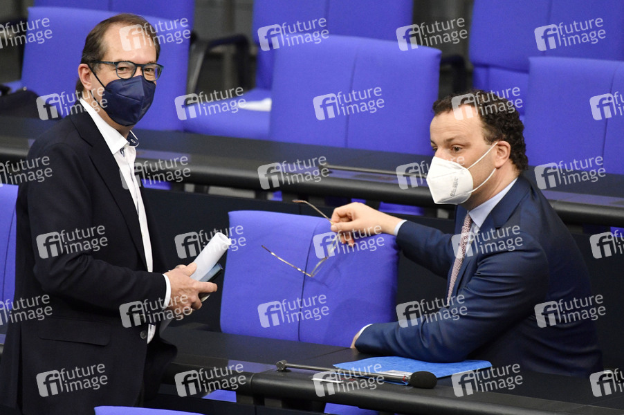 Alexander Dobrindt und Jens Spahn in der 213. Sitzung des Deutschen Bundestages im Reichstagsgebäude. Berlin, 26.02.2021