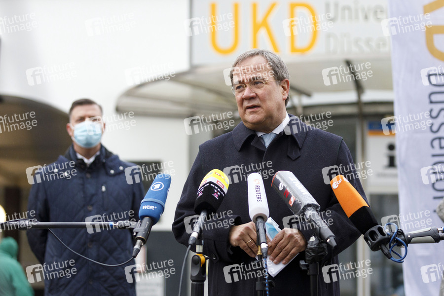 Armin Laschet bei einem Pressestatement vor dem Universitätsklinikum Düsseldorf. In Rekordzeit hat das UKD eine räumlich vollständig getrennte Neubau-Einheit zur Versorgung von COVID-19-Patienten erbaut. Das Gebäude bietet 18 Intermediate-Care-Plätze und 25 Intensivplätze. Damit verfügt das Universitätsklinikum über eine der modernsten Intensiveinheiten Europas. Düsseldorf, 30.12.2020