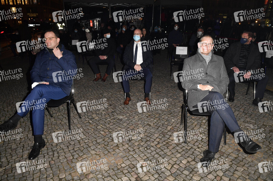Jens Spahn und Michael Müller beim Zünden der ersten Kerze am Chanukka-Leuchter anlässlich der beginnenden Chanukka-Feiertage am Brandenburger Tor. Berlin, 10.12.2020