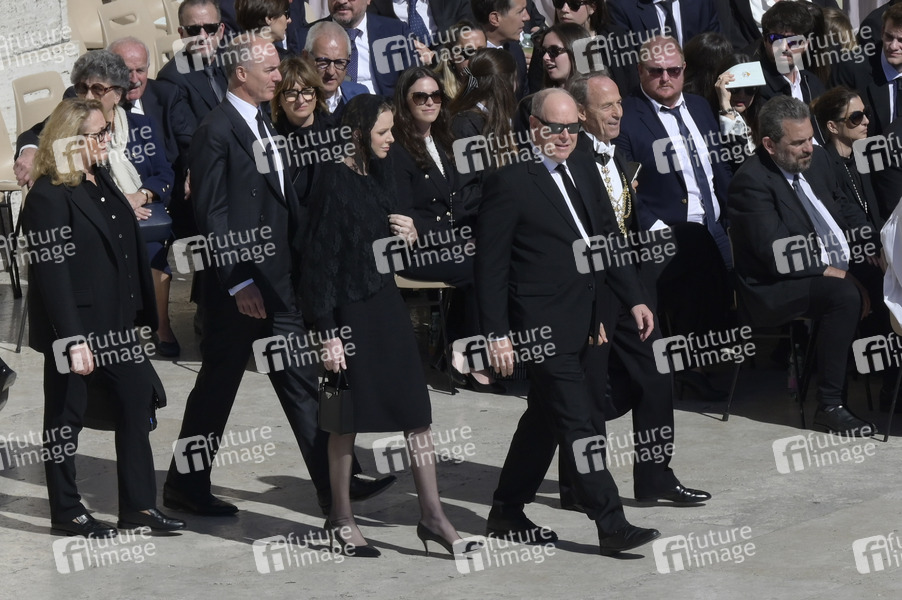 Albert II. von Monaco mit Ehefrau Charlene von Monaco bei der Trauermesse für den verstorbenen Papst Franziskus auf dem Petersplatz. Vatikanstadt, 26.04.2025