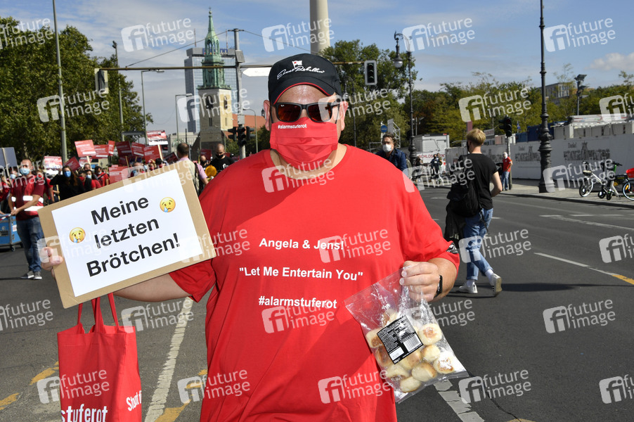 Unter dem Motto #AlarmstufeRot protestieren Mitarbeiter der Kultur-und Veranstaltungsbranche in Berlin für Soforthilfen für die Veranstaltungswirtschaft. Durch die Schließungen und Absage von Veranstaltungen während der Corona-Pandemie stehen viele Kulturschaffende, Veranstalter, Messe- oder Bühnenbauer, Techniker und Kunstschaffende vor dem Aus. Berlin, 09.09.2020