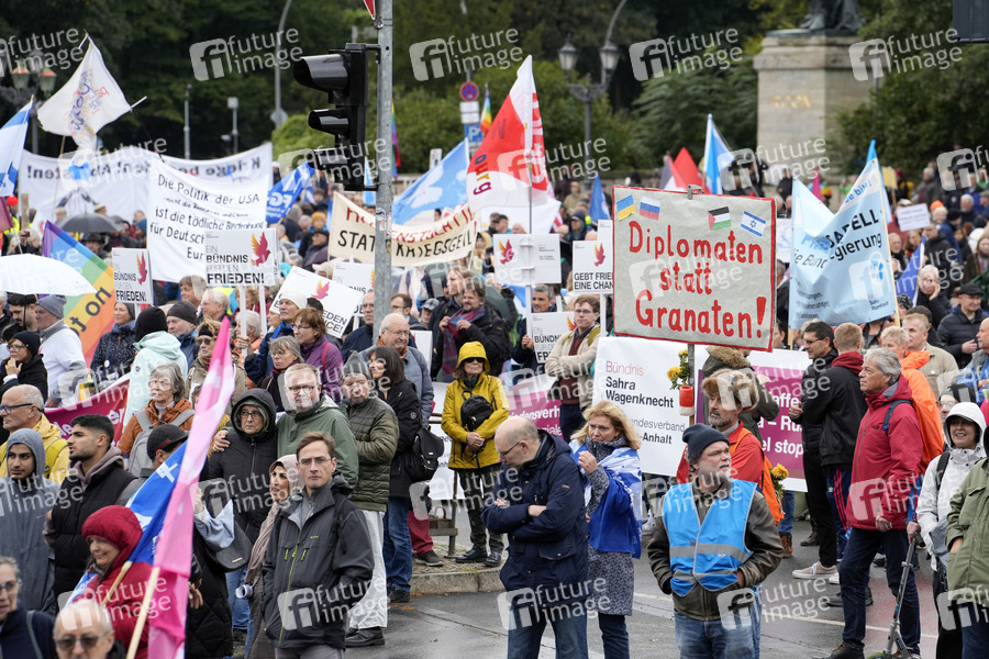 Friedensdemonstration unter dem Motto 'Nein zu Krieg und Hochrüstung! Ja zu Frieden und internationaler Solidarität' vor der Siedessäule am Großen Stern. Berlin, 03.10.2024