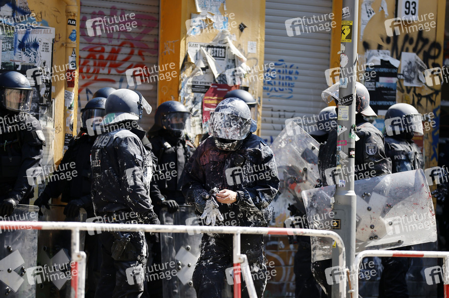 Im teilbesetzten Haus in der Rigaer Straße 94 sollte am Donnerstag der Brandschutz überprüft werden. Nachdem die Bewohner sich zunächst weigerten, die Tür zu öffnen, verschaffte sich die Polizei gewaltsam Zutritt und wurde mit Farbe beworfen. (Quelle: rbb online) Berlin, 17.06.2021