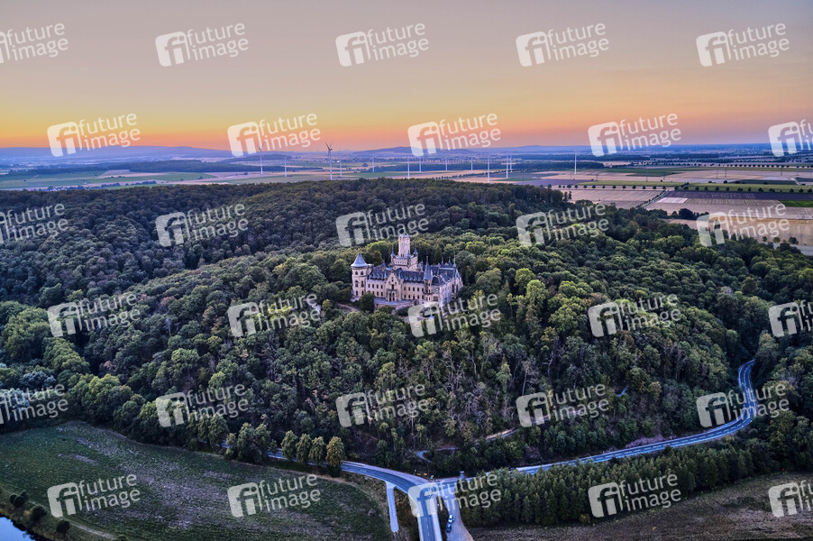 Sonnenuntergang am Schloss Marienburg auf dem Marienberg (Eine schriftliche Freigabe der Luftbilder durch die Pressesprecherin Annette Langhorst liegt vor). Nordstemmen, 13.08.2022