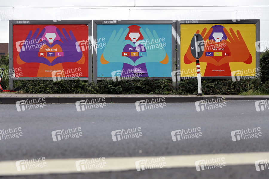 Eine Werbung für den TV-Sender RTL mit dem neuen Slogan 'Wir sind RTL' hängt in Köln Deutz an Plakatwänden. Die Mediengruppe RTL heißt fortan RTL Deutschland und hat sich ein neues Corporate Design mit neuem RTL-Logo gegeben. Die Mediengruppe will schrittweise ihre gesamte Markenarchitektur unter dem Namen RTL plattformübergreifend harmonisieren. (Themenbild, Symbolbild) Köln, 04.07.2021