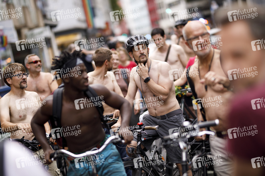 Teilnehmer des ersten Cologne Naked Bike Ride auf der Schaafenstraße. Köln, 12.07.2019