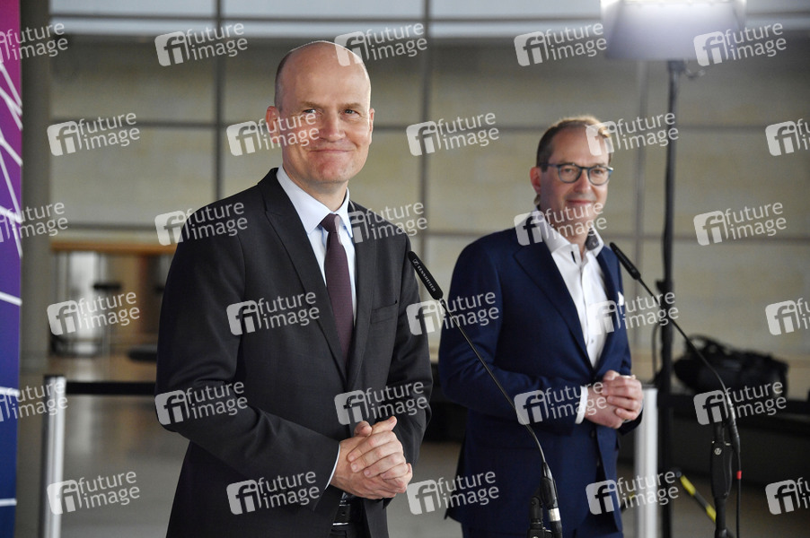 Ralph Brinkhaus und Alexander Dobrindt bei einem Pressestatement der CDU/CSU-Bundestagsfraktion vor der Fraktionssitzung auf der Fraktionsebene im Reichstagsgebäude. Berlin, 13.04.2021