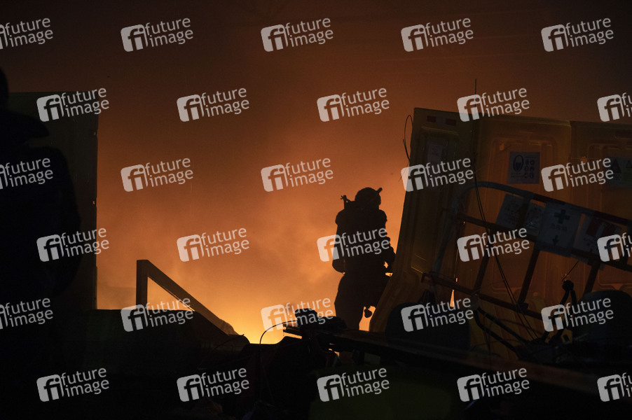 Der Eingang der Polytechnischen Universität von Hongkong wird angezündet um den Polizeiangriff zu stoppen - Belagerung an der Polytechnischen Universität. Die Polizei umstellt den Campus der Universität, nachdem Demonstranten den Cross-Harbor-Tunnel und die Hauptstraße außerhalb des Campus blockiert haben. Hongkong protestiert seit fünf Monaten ununterbrochen. Am Montag, dem 11. November 2019, begann ein Streik in der ganzen Stadt, der Teile von Hongkong zum Erliegen brachte, als MTR-Stationen geschlossen und mehrere Straßensperren errichtet wurden. Hongkong, 18.11.2019
