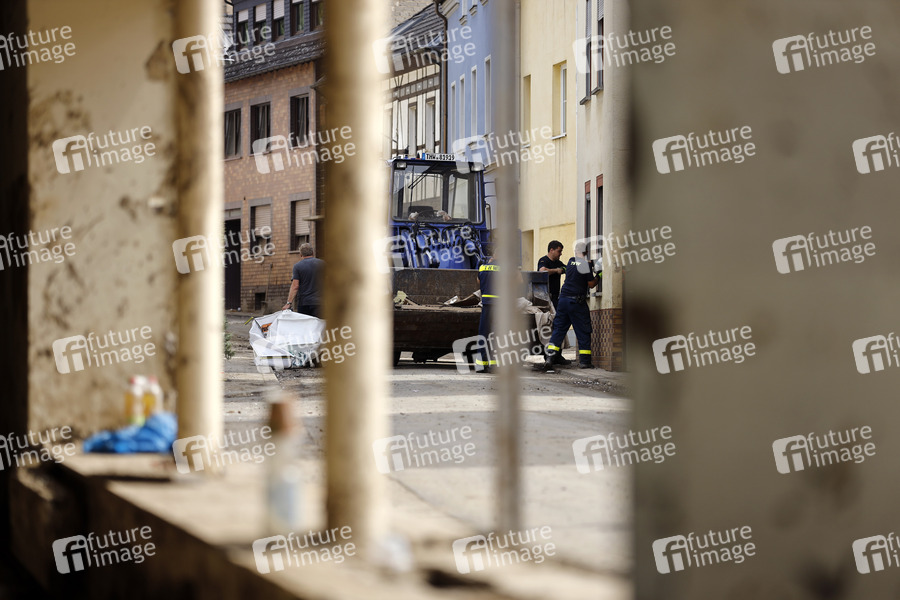 Nach dem Jahrhunderthochwasser in der Eifel durch heftige Regenfälle und Dauerregen mit Überschwemmungen und Überflutungen haben die Aufräumarbeiten im Ahrtal große Fortschritte gemacht. Einheiten von Polizei, THW, Bundeswehr und Feuerwehr mitsamt vielen freiwilligen Helfern haben Straßen geräumt, Schutt und Schlamm entfernt und die Menschen versorgt. Der Wiederaufbau wird trotzdem Jahre dauern. Im Bild Flutschäden in der Ortschaft Mayschoß, in der die Flut viele Häuser zerstörte, 08.08.2021
