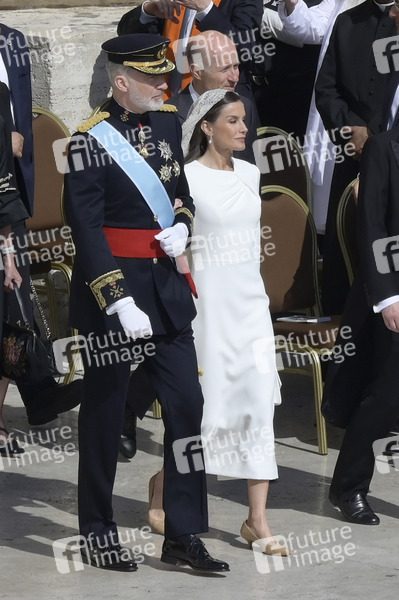 König Felipe VI. von Spanien mit Ehefrau Königin Letizia von Spanien bei der Amtseinführung von Papst Leo XIV. auf dem Petersplatz. Vatikanstadt, 18.05.2025
