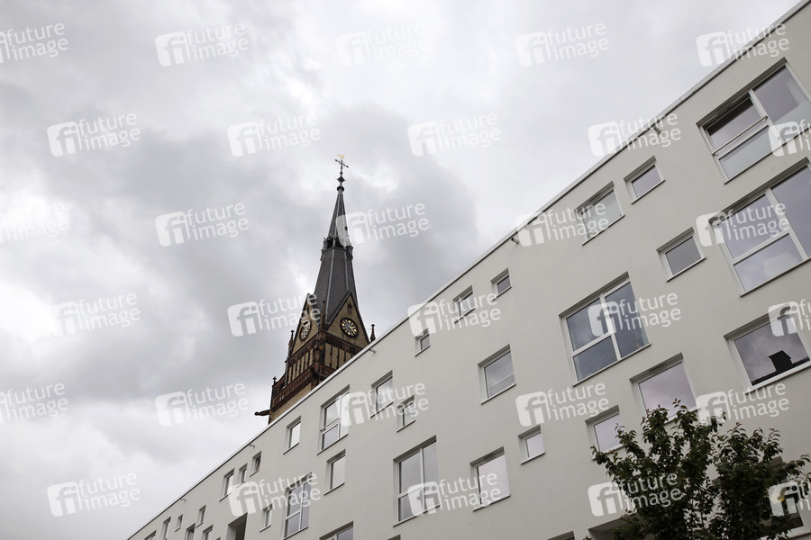 Der Turm der Christuskirche ragt über Gebäude im Belgischen Viertel in Köln. Im Erzbistum Köln schwelt ein Konflikt: Während Kritiker von Kardinal Woelki wegen dessen Umgang mit Kindesmissbrauch in der katholischen Kirche auf einen Neuanfang setzen, lehnt der dieser seinen Rücktritt kategorisch ab. Termine für Kirchenaustritte sind auf Monate hin ausgebucht. (Themenbild, Symbolbild) Köln, 26.06.2021