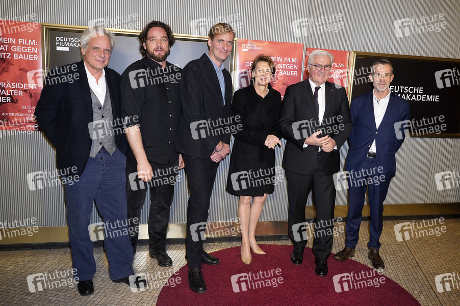 Thomas Kufus, Ronald Zehrfeld, Lars Kraume, Elke Büdenbender, Frank-Walter Steinmeier und Ulrich Matthes beim Fototermin zur Veranstaltungsreihe 'Mein Film' mit Gespräch und Präsentation des Fernsehfilms 'Der Staat gegen Fritz Bauer' in der Astor Film Lounge. Berlin, 03.12.2019