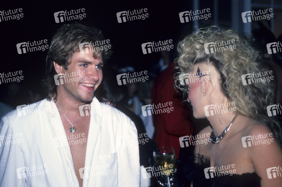 Simon Le Bon von Duran Duran und Alannah Currie Thompson Twins bei der Party zum Release der Thompson Twins LP 'Into the Gap' im Stocks Club. Aldbury, 26.06.1984