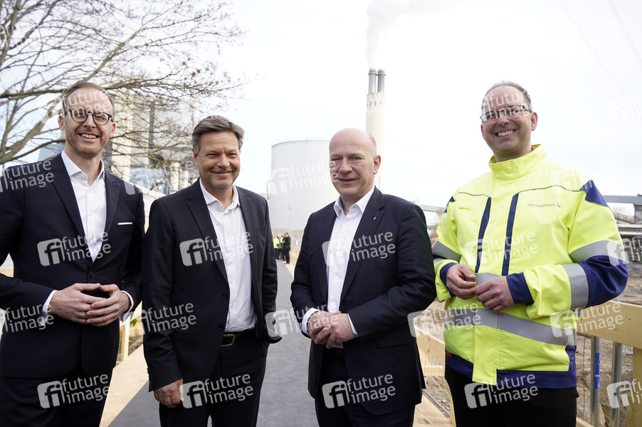 Christian Feuerherd, Robert Habeck, Kai Wegner und Christoph Donner bei der Grundsteinlegung einer Abwassergroßwärmepumpe von Vattenfall und Befüllen einer Zeitkapsel auf dem Kraftwerksgelände Reuter-West. Berlin, 12.03.2024