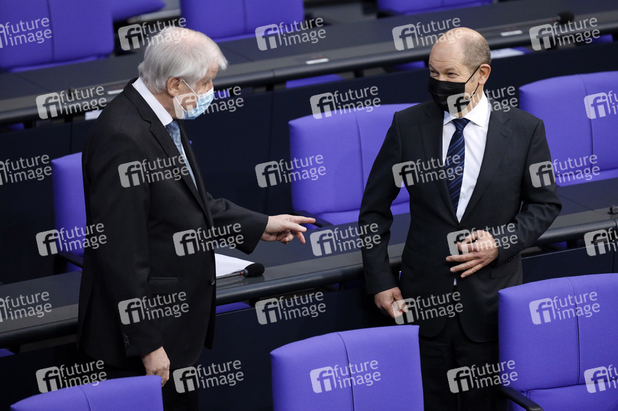 Horst Seehofer und Olaf Scholz in der 203. Sitzung des Deutschen Bundestages im Reichstagsgebäude. Berlin, 13.01.2021