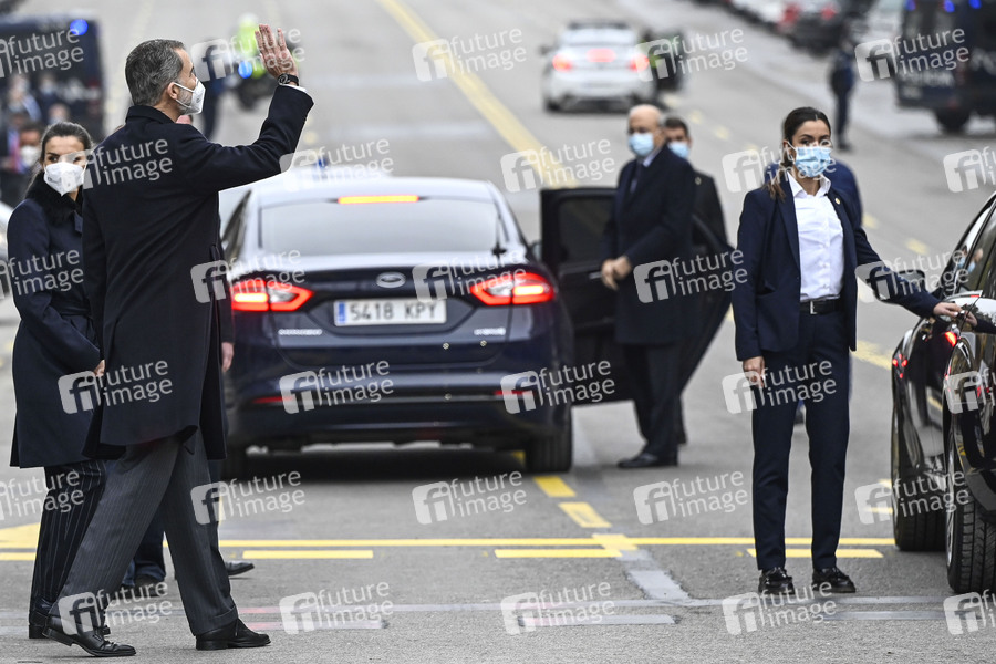 Königin Letizia von Spanien und König Felipe von Spanien bei der Einweihung eines Denkmals des Bildhauers Jaume Plensa auf der Plaza de Los Sagrados Corazone zum Gedenken an das Gesundheitspersonal, das bei der Ausübung ihres Berufs währende der Corona-Pandemie ums Leben kam. Madrid, 18.12.2020