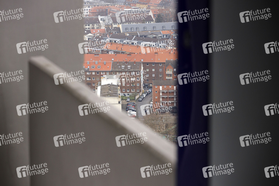 Beim Blick aus dem 31. Stock über das Notfall-Treppenhaus im Herkules-Hochhaus kann es zu Höhenangst kommen. (Themenbild, Symbolbild) Köln, 03.02.2021