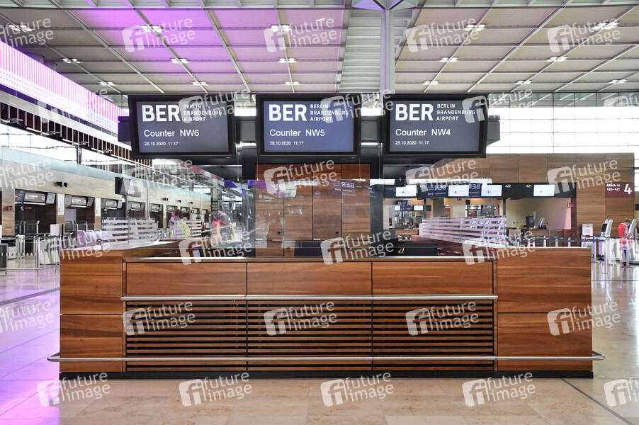 Rundgang durch den öffentlichen Bereich des Terminals 1 mit Check-in-Halle und Besucherterrasse auf dem Flughafen Berlin Brandenburg. Schönefeld, 28.10.2020