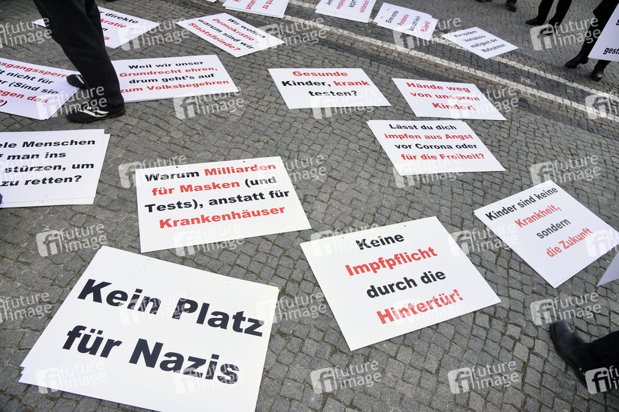 Protest, Demo, Demonstration, Corona-Maßnahmen-Kritiker, Corona-Hygieneregeln, Distanz, Mund-Nasen-Schutz, Protestierende, Demonstranten, Polizei, Polizisten, Querdenker, CoronaleugnerGegner der Corona-Maßnahmen, Infektionsschutzgesetz, Corona-Notbremse, Eindämmung der dritten Pandemiewelle, Teilnehmer, Corona-Regeln, Pandemien, Corona-Demo, Coronademo