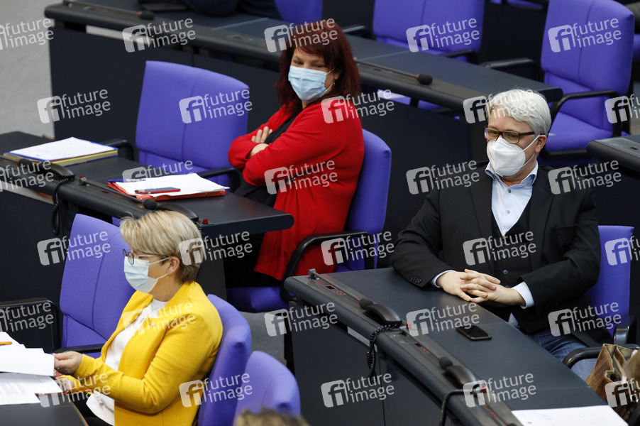 Politiker (Katrin Werner, Gabriele Katzmarek und Sönke Rix) m Deutschen Bundestag von DIE LINKE und SPD tragen durch Zufall die Farben der Nationalflagge (Schwarz, Rot, Gold) auf. Schwarz-Rot-Gold sind nach Artikel 22 des deutschen Grundgesetzes die Farben der Flagge der Bundesrepublik Deutschland. Traditionell führt man die Farben auf die Befreiungskriege von 1813 bis 1815 zurück. (Themenbild, Symbolbild) Berlin, 12.02.2021
