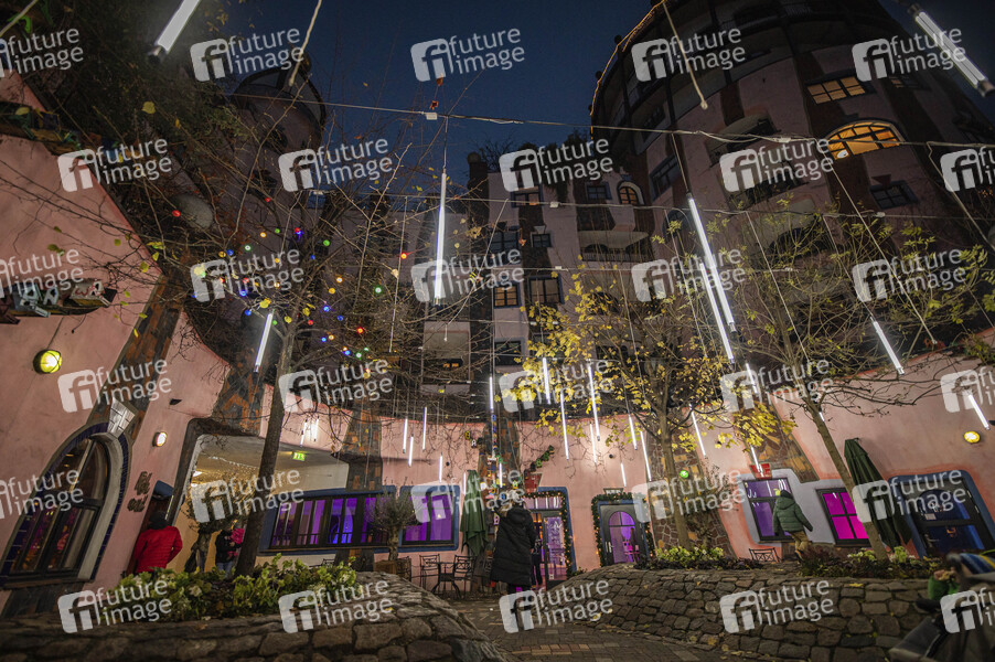 Lichterwelt vor dem Hunderwasserhaus - Die Licherwelt Magdeburg mit der umfangreichste Weihnachts- und Winterbeleuchtung in Mitteldeutschland verteilt über die ganze Stadt. Magdeburg, 27.11.2022