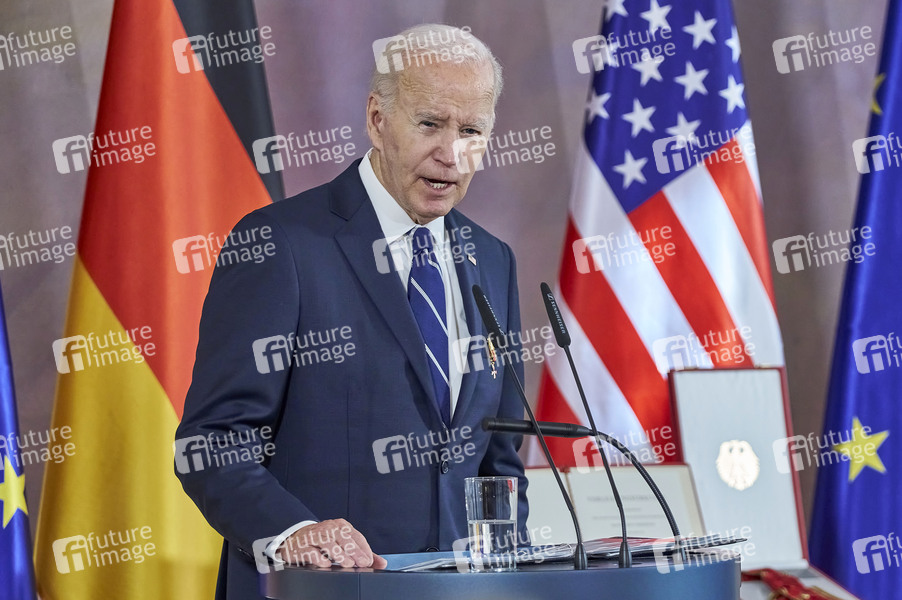 Joe Biden bei der Verleihung der Sonderstufe des Großkreuzes des Verdienstordens der Bundesrepublik Deutschland an Präsident Biden für dessen Einsatz für die deutsch-amerikanische Freundschaft und die transatlantische Partnerschaft im Schloss Bellevue. Berlin, 18.10.204