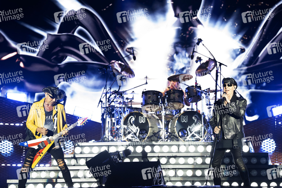Rudolf Schenker, Mikkey Dee und Klaus Meine von den Scorpions live bei der Konzertreihe 'Moon&Stars 2025' auf der Piazza Grande. Locarno, 12.07.2025