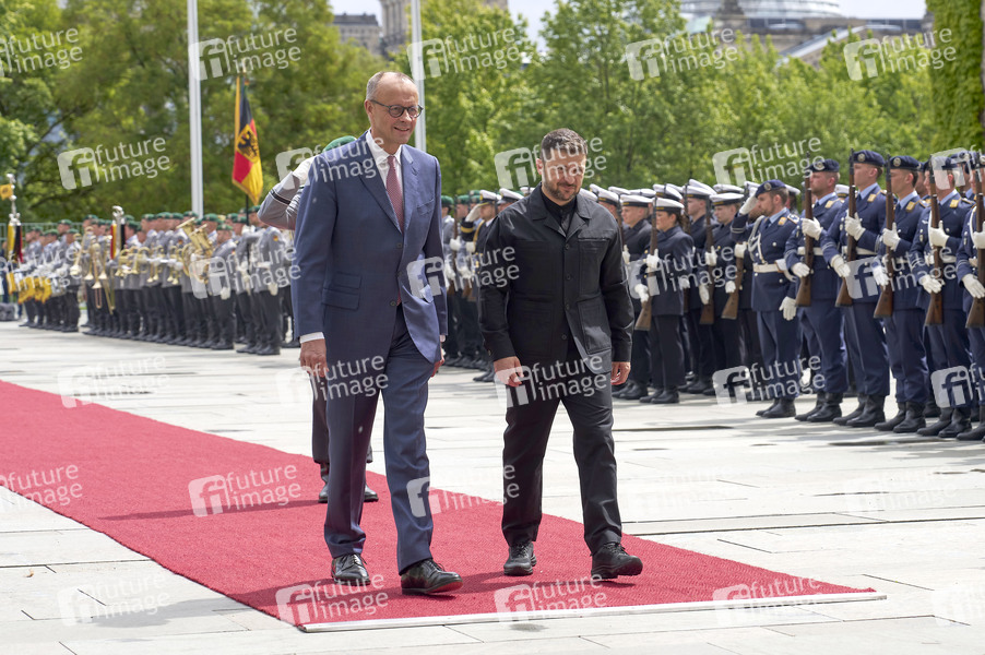 Friedrich Merz und Wolodymyr Selenskyj beim Empfang des Präsidenten der Ukraine mit militärischen Ehren und zu einem gemeinsamen Gespräch mit anschließendem Pressestatement im Bundeskanzleramt. Berlin, 28.05.2025