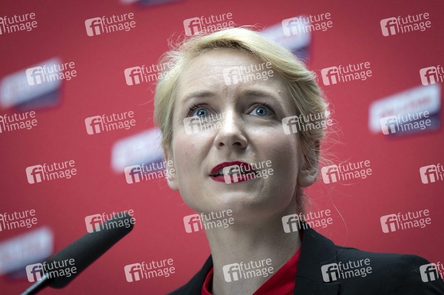 Ines Schwerdtner bei einem Pressestatement der Partei Die Linke im Reichstagsgebäude. Berlin, 12.03.2025