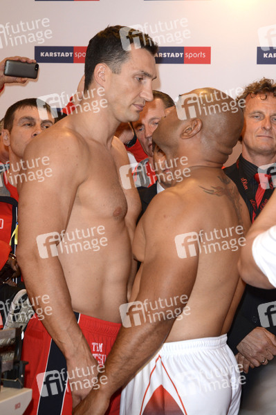 Wladimir Klitschko und Alex Leapai beim Einwiegen anlässlich des WM-Boxkampfs Wladimir Klitschko vs Alex Leapai in den Karstadt Arkaden vom Rhein-Ruhr Zentrum. Mülheim an der Ruhr, 25.04.2014