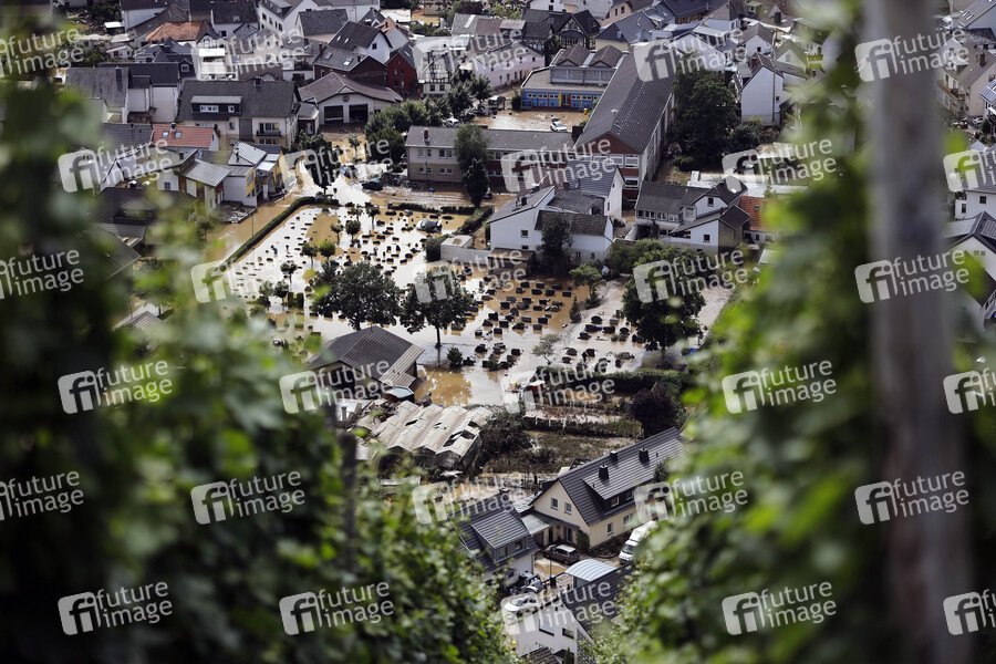 In der Eifel haben heftige Regenfälle und Dauerregen für Überschwemmungen und Überflutungen gesorgt. Im Ahrtal trat der Fluss vielerorts über die Ufer und überschwemmte nicht nur Keller sondern ganze Ortschaften. Im Bild der überspülte Friedhof in dem Ort Dernau (Landkreis Ahrweiler), der beinahe komplett von den Wassermassen geflutet wurde. Viele Menschen verloren alles. Dernau, 15.07.2021