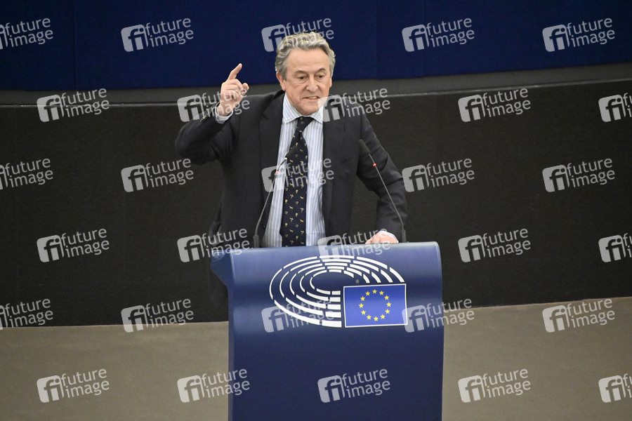 Hermann Tertsch bei einer Plenartagung mit Laufenden Anhörungen gemäß Artikel 7 Absatz 1 EUV zu Polen und Ungarn im Plenarsaal des Europäischen Parlaments. Straßburg, 06.04.2022