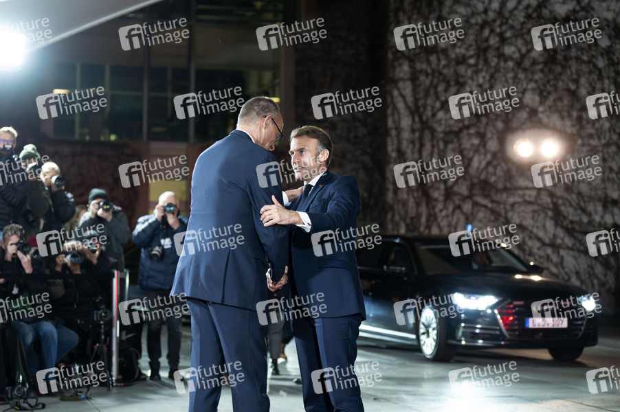 Friedrich Merz und Emmanuel Macron beim Empfang zum Ukraine-Gipfel im Bundeskanzleramt. Berlin, 15.12.2025