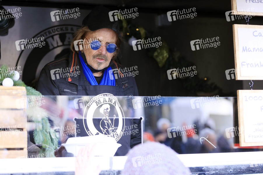 Frank Zander bei der Spendenscheckübergabe an den Caritas-Foodtruck und der Verteilung von Essen und Geschenken aus dem Food Truck an Obdachlose und Bedürftige am Alexanderplatz. Berlin, 02.12.2021
