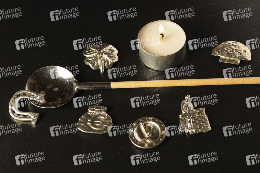 Zinn, Tradition, Schmelzen, Bleigießen-Verbot, Kerze, Schmelzlöffel, Kerzenflamme, Wasserglas, Silvesterbrauch, Jahreswechsel, Symbolbild, Themenbild