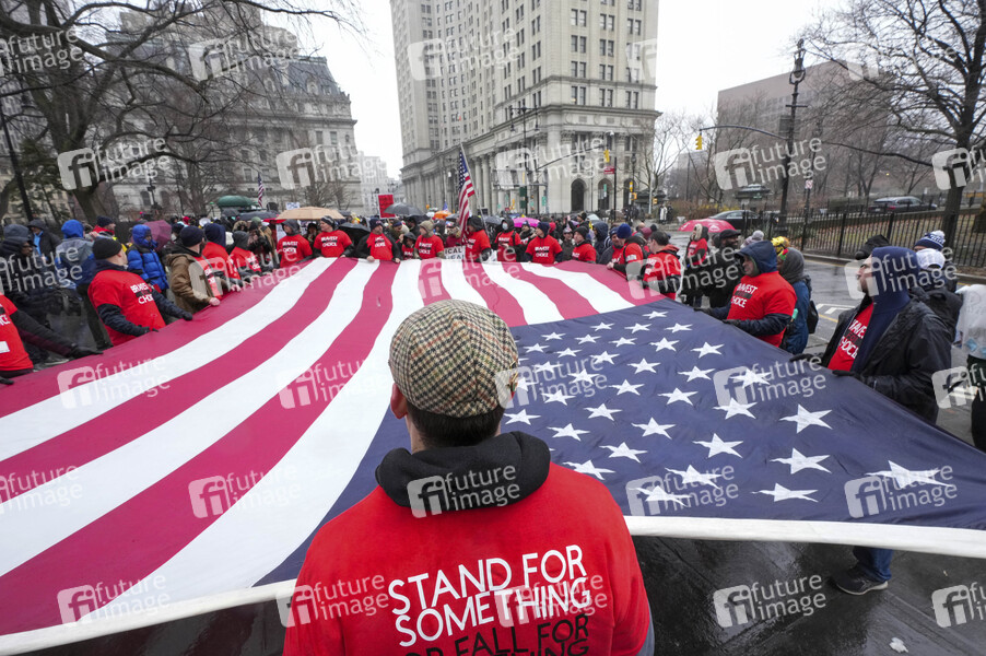 Über 300 Stadtarbeiter und andere protestieren mit einem Marsch über die Brooklyn Bridge, gegen die Ankündigung der Stadt, dass kommunale Angestellte ohne Covid-19-Impfung bis zum Ende der Woche entlassen würden. New York, 07.02.2022