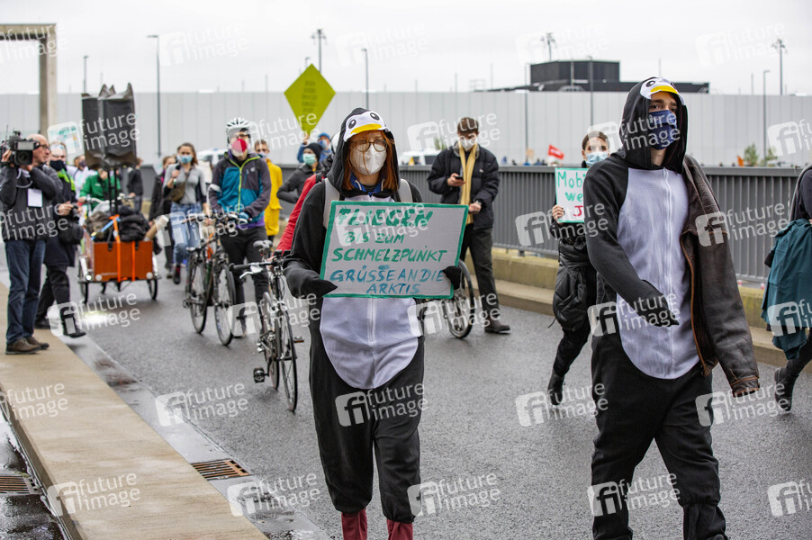 Protestaktionen von Mitgliedern des Bündnisses 'Am Boden bleiben' bei der Eröffnung des Flughafens Berlin-Brandenburg (BER). Schönefeld, 31.10.2020