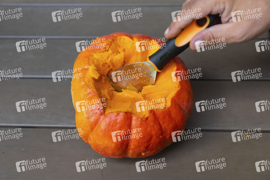 Kürbis schnitzen, Kürbisse, Cucurbita, Halloween, Herbst, Kürbisfruchtfleisch, Kürbiswände, Kürbis Gesicht, Kürbis-Schnitzset, Deko, Symbolbild, Themenbild