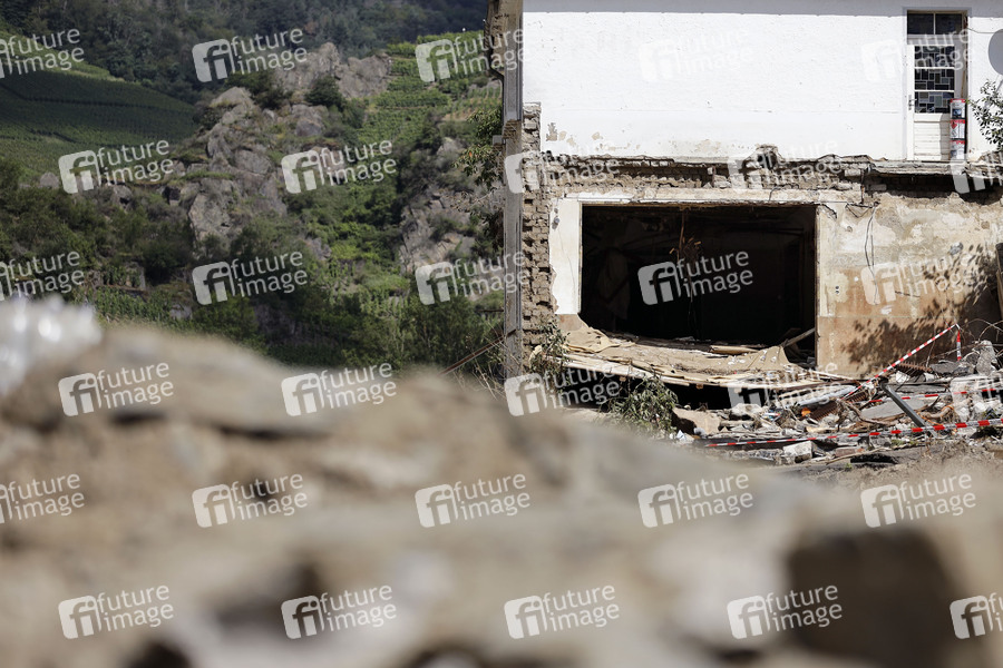 Nach dem Jahrhunderthochwasser in der Eifel durch heftige Regenfälle und Dauerregen mit Überschwemmungen und Überflutungen haben die Aufräumarbeiten im Ahrtal große Fortschritte gemacht. Einheiten von Polizei, THW, Bundeswehr und Feuerwehr mitsamt vielen freiwilligen Helfern haben Straßen geräumt, Schutt und Schlamm entfernt und die Menschen versorgt. Der Wiederaufbau wird trotzdem Jahre dauern. Im Bild Flutschäden bei der Ortschaft Mayschoß, in der die Flut viele Häuser zerstörte, 30.07.2021