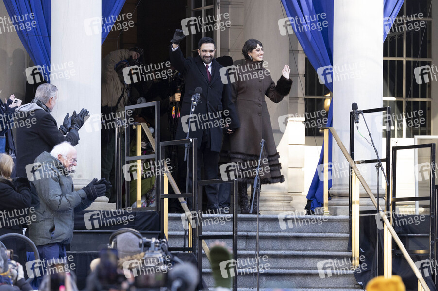 Zohran Mamdani mit Ehefrau Rama Duwaji bei der Amtseinführung des ersten muslimischen Bürgermeisters von New York City in Rathaus. New York, 01.01.2026